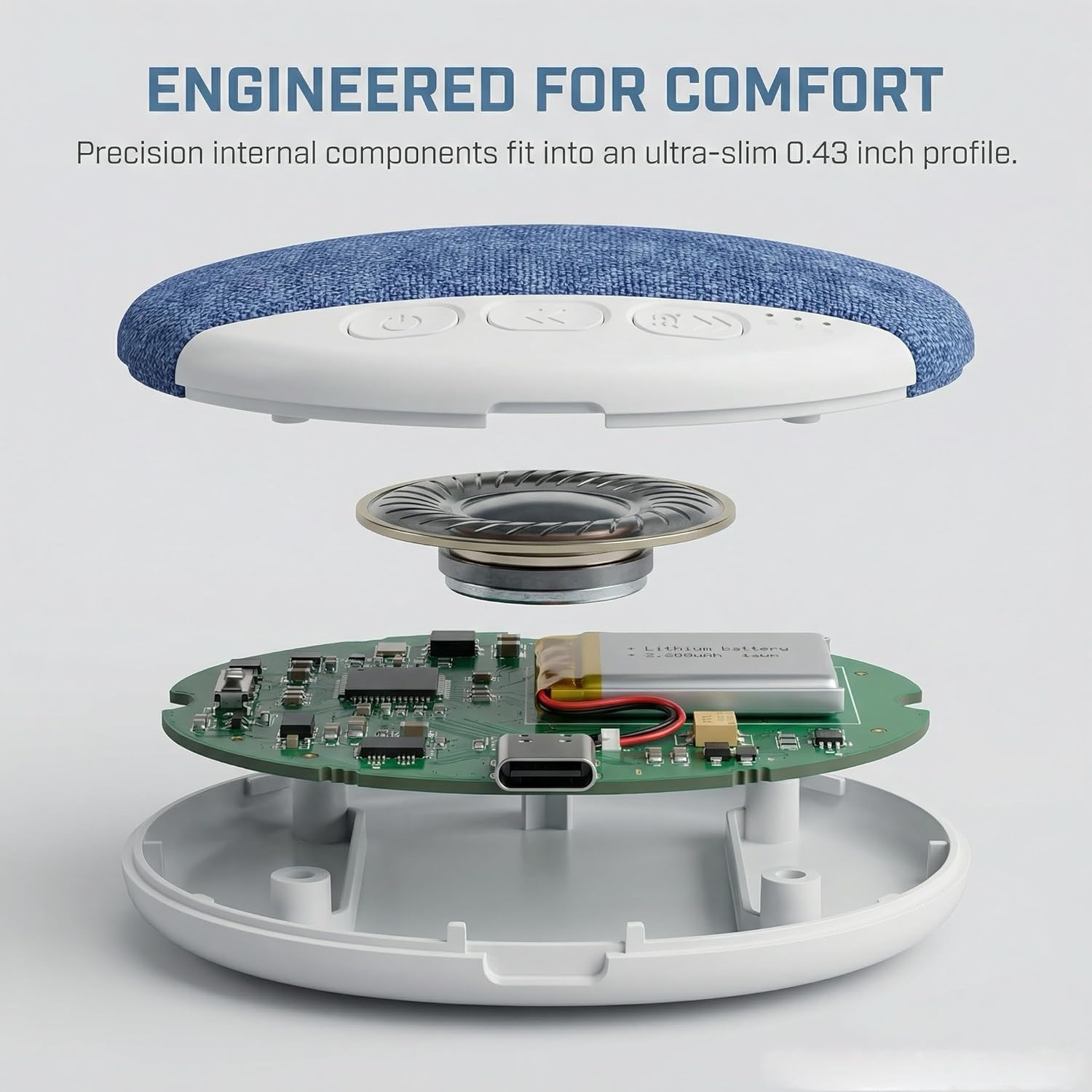 Ultra tanek dizajn (le približno 11 mm) omogoča, da zvočnik enostavno položite pod vzglavnik brez neprijetnega pritiska na uho. Idealen je za spanje na boku, saj ne moti vašega položaja in zagotavlja naraven občutek med počitkom.
